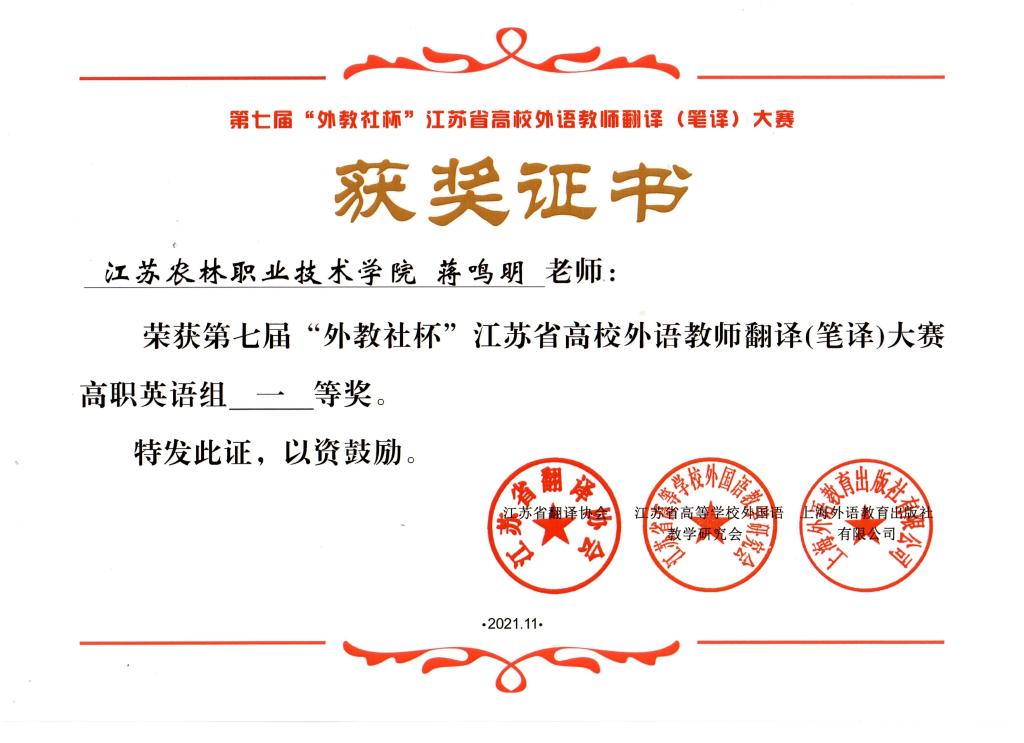 11月26日下午,第七届江苏省高校外语教师翻译(笔译)大赛在苏州大学应用技术学院落下帷幕。我院蒋鸣明老师代表学校参赛,荣获高职英语组一等奖(全省3名)。