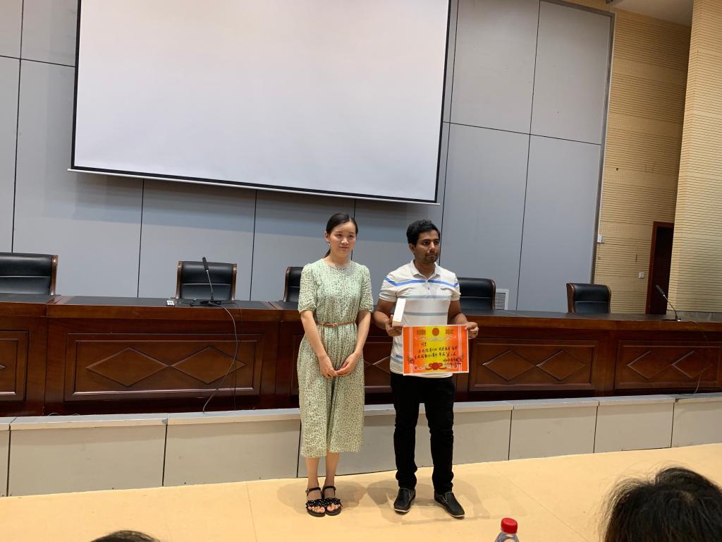 经过1个小时的激烈角逐,各个奖项也已尘埃落定。来自印度尼西亚的留学生阿吉演唱的中英混合剪辑版的《时间都去哪儿了》获得本次比赛的冠军;来自老挝的留学生博豪的中文弹唱歌曲《童话》获得亚军;来自孟加拉的留学生孟奇演唱的孟加拉歌曲《OKNUD》获得季军。