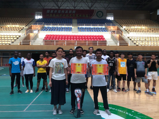 赛前学院邀请了羽毛球教练成群老师前来指导,给同学们讲解羽毛球运动规则与技巧。比赛前留学生们摩拳擦掌、跃跃欲试、勤奋练习,比赛中大家努力拼搏、斗志昂扬,场外自发组织的拉拉队锣鼓喧天、呐喊助威。经过激烈的角逐,来自孟加拉的留学生孟学礼和安祖获得冠军,来自孟加拉的留学生孟莱和孟凯获得亚军,来自孟加拉的留学生孟奇和比尔获得季军。