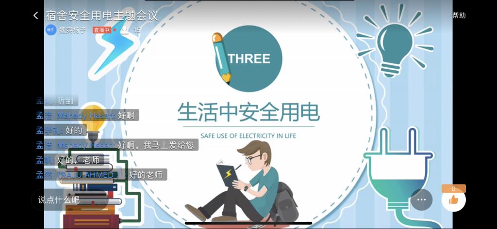 炎热夏季即将来临,学生宿舍也将迎来用电高峰期,为了加强在校留学生的安全意识和掌握宿舍电器安全使用方法,防范用电事故发生,学院特举办线上“生活安全用电”专题培训,全体在校留学生参加线上培训。