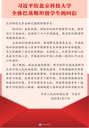 习主席的重要回信中对各国优秀青年来华学习深造表示欢迎,鼓励大家要多同中国青年交流,同世界各国青年交流。同学们纷纷表示习主席的回信字字句句都情真意切、催人奋进,大家通过微信视频表达了对学校疫情防控工作的赞赏,对学院疫情防控期间为他们提供的帮助表示感谢。