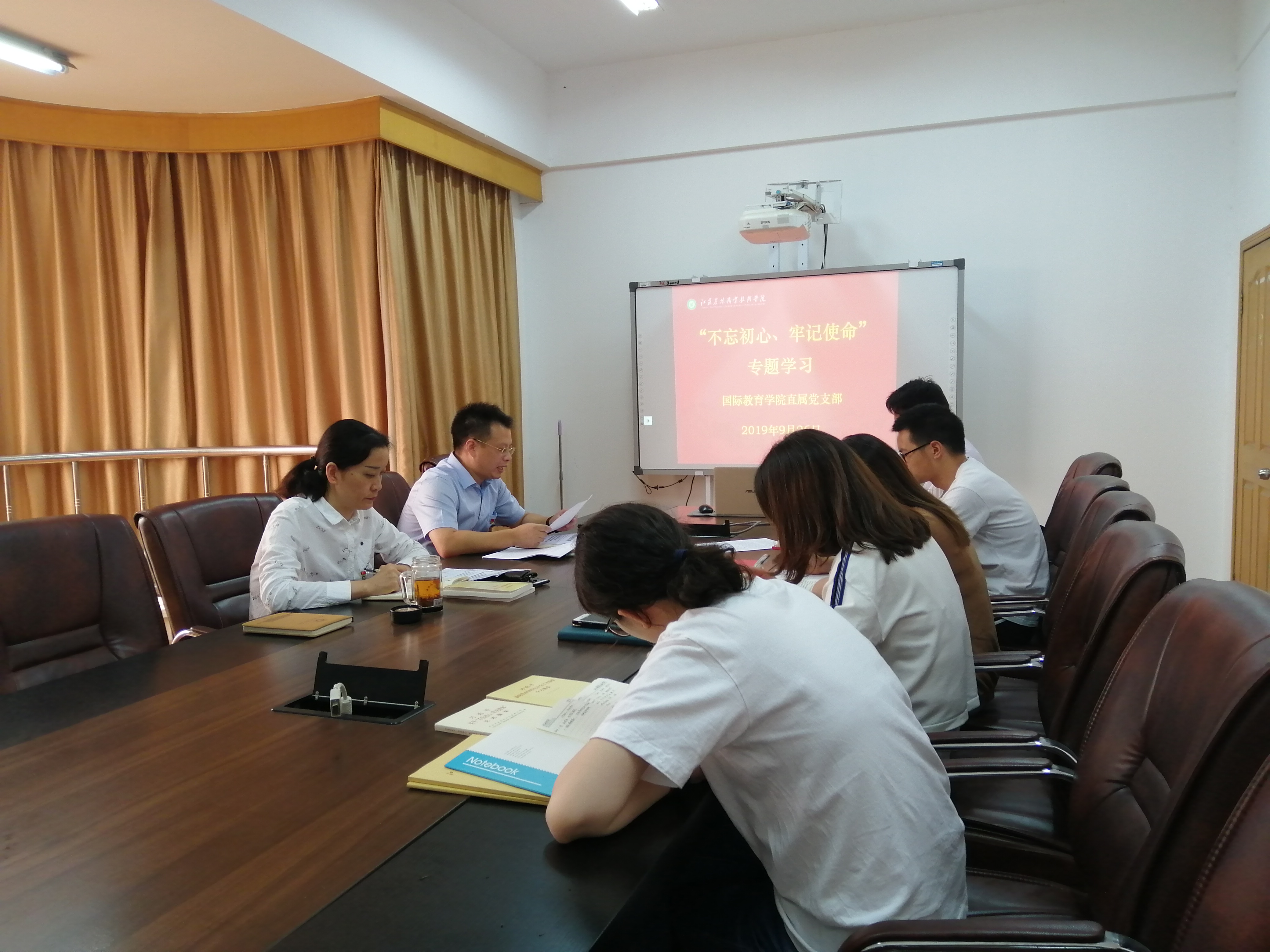 按照党中央、省委“不忘初心、牢记使命”主题教育统一部署,2019年9月18日下午,国际学院直属党支部全体党员在综合楼5楼教务处会议室开展了首次集体专题学习研讨会。会议由国际教育学院直属党支部副书记(主持工作)郭俊主持。