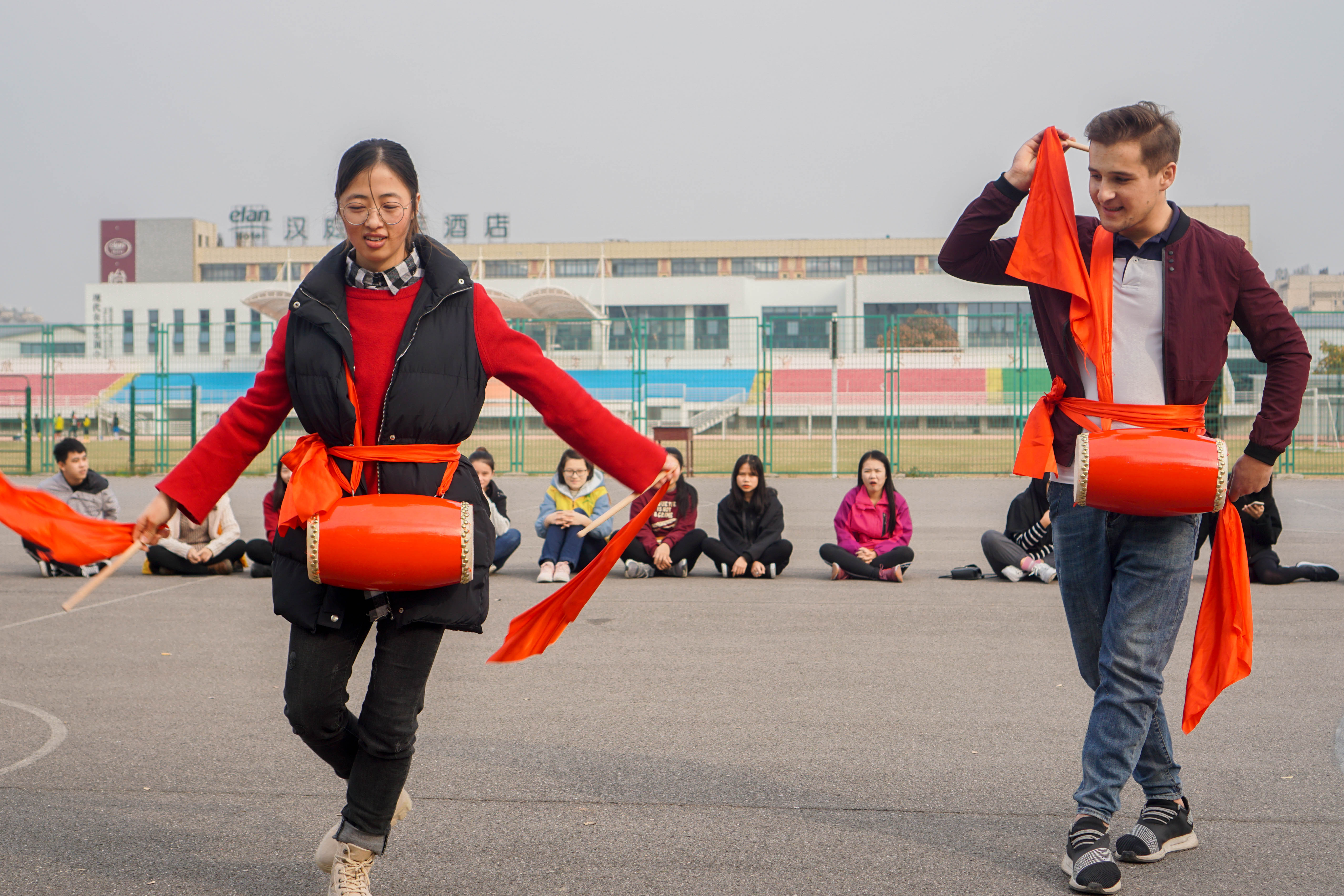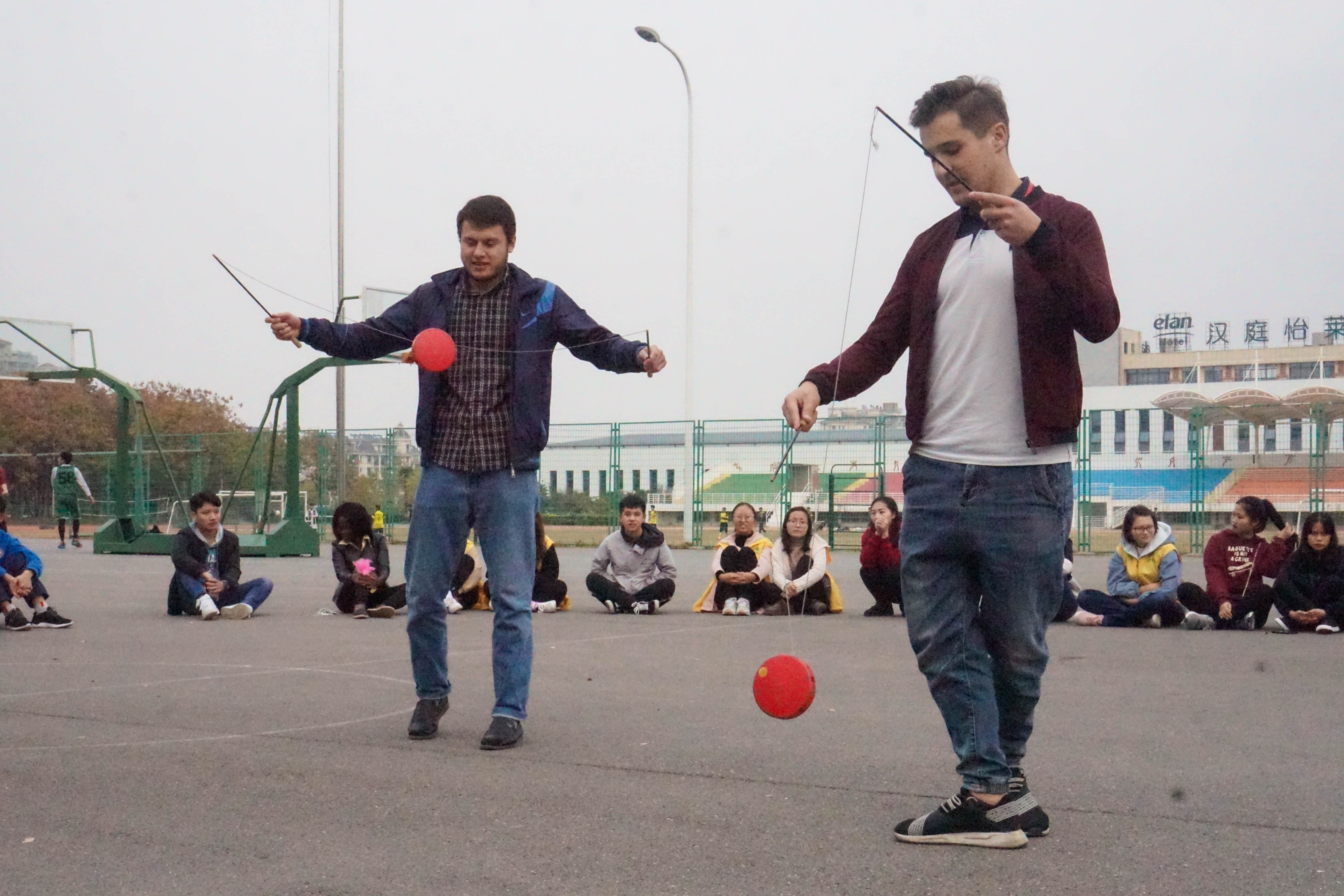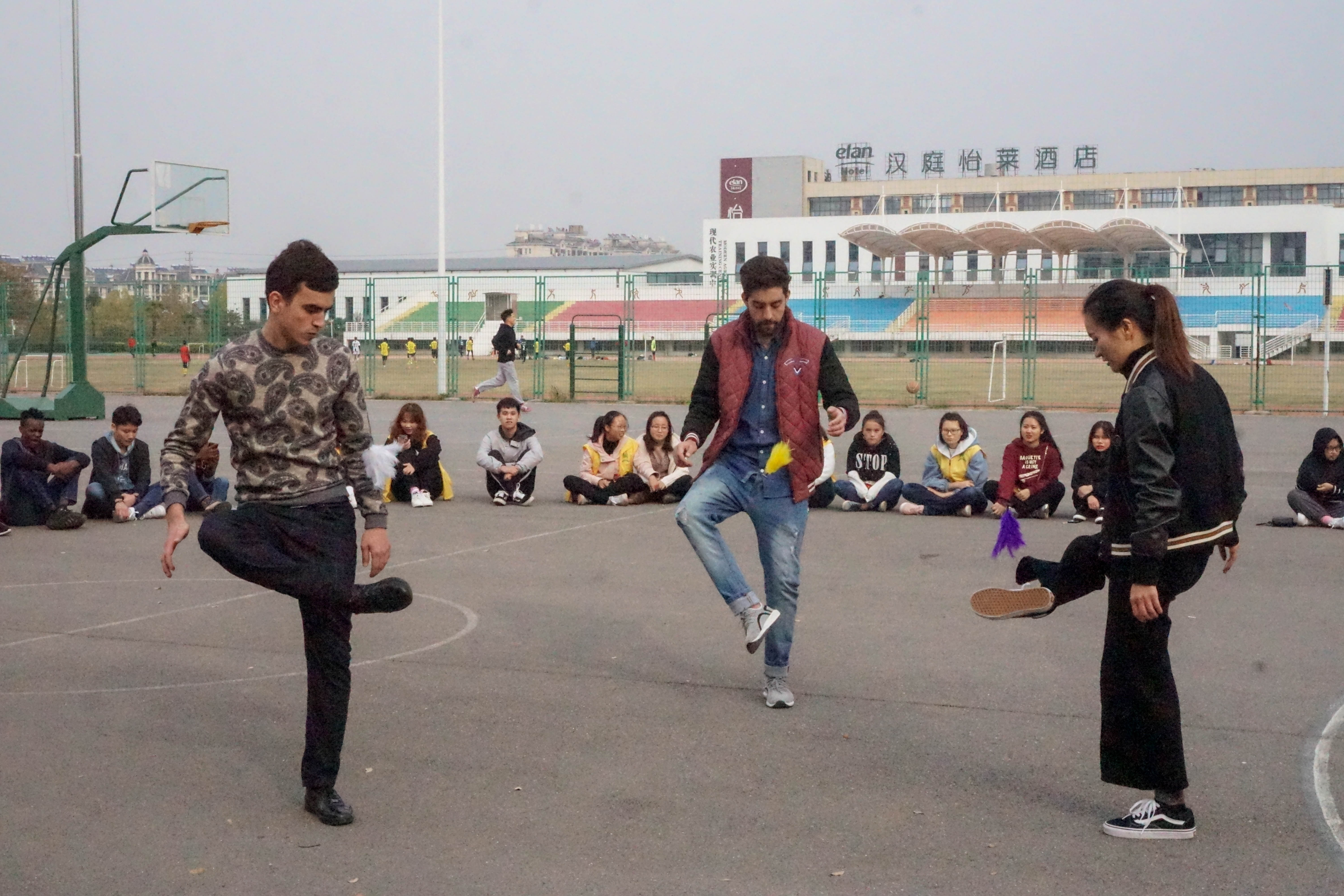 活动伊始,先是中国传统技艺——花样腰鼓、空竹的表演,引得留学生们跃跃欲试,表演的同学细心讲解,使得留学生们很快掌握了技巧,腰鼓的击敲声、空竹的抖响声响切云霄,让在场的同学们连连称赞;在随后的趣味踢毽子和花样跳绳中,同学与留学生们都大展身手,使出浑身解数变换着各种花式,留学生们轻快活力的身影更是让同学们连连叫好,甘拜下风;最后,在激烈的篮球友谊赛中结束了本次的活动。