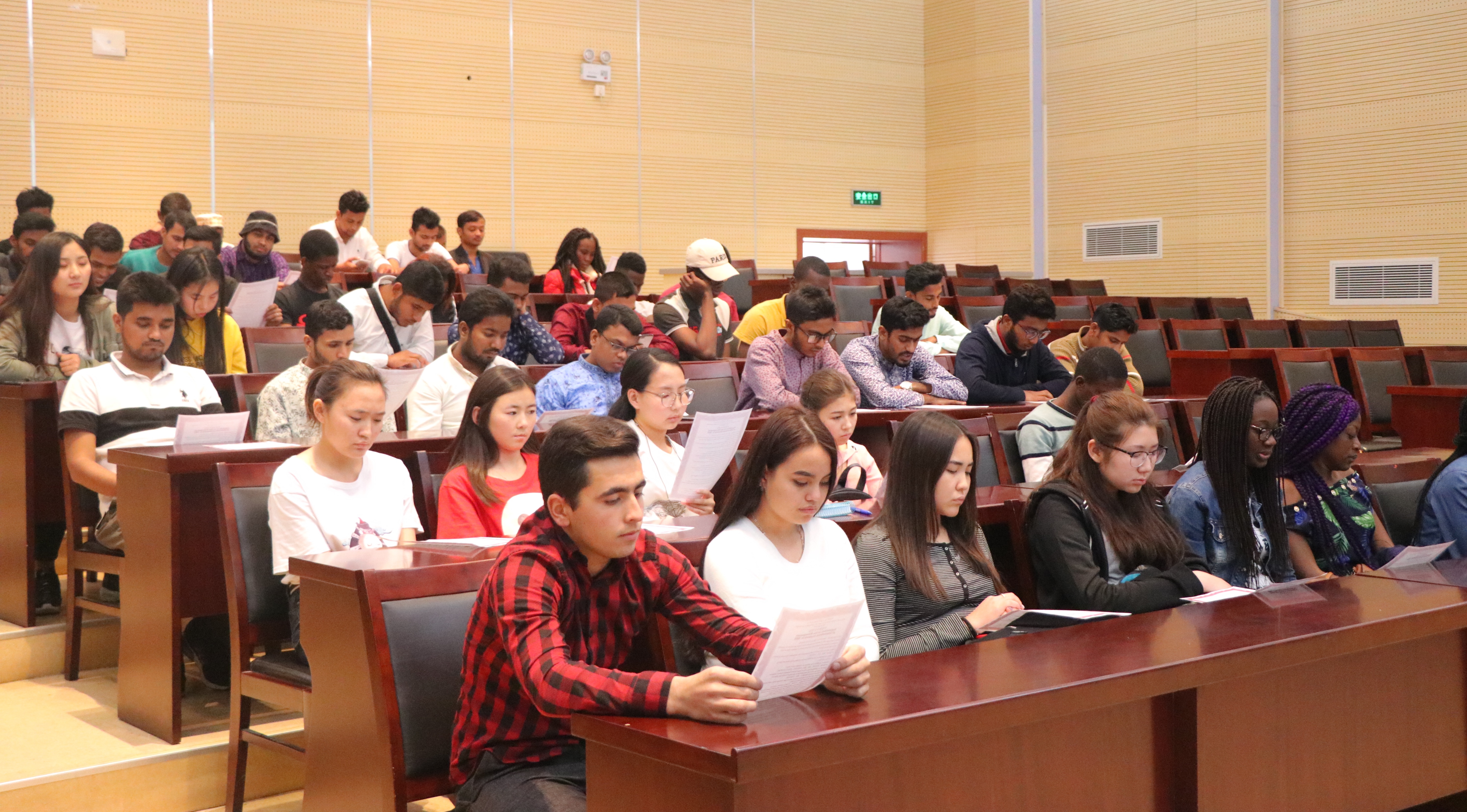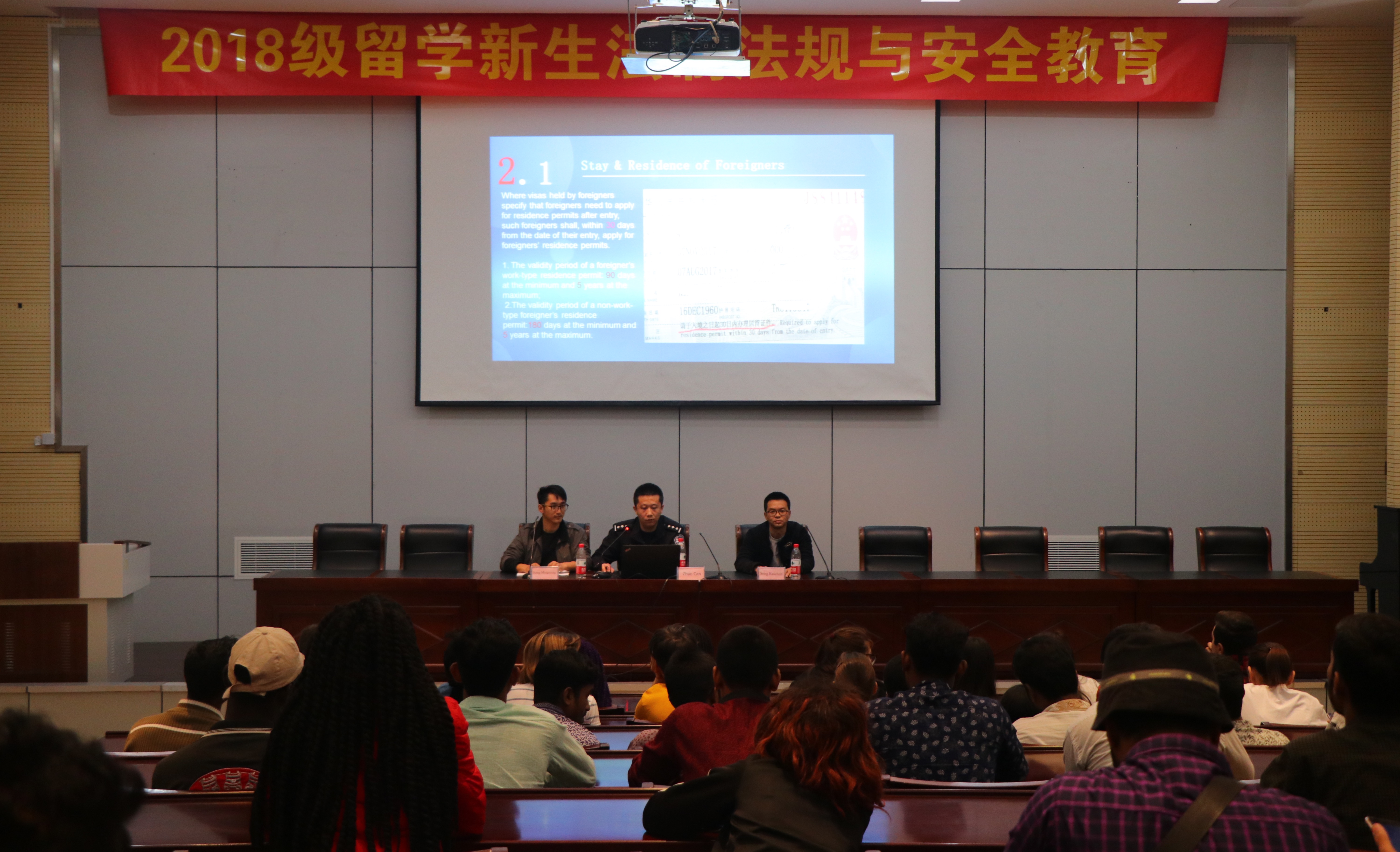 近日,为推动我院外国留学新生的规范管理,加深留学新生对我国法律法规和有关治安管理条例的理解与认知,提高来华留学新生的安全防范意识,国际交流合作中心邀请句容市公安局出入境管理支队警官和学院安全保卫处教师为留学新生们开展了以“2018级留学新生法律法规与安全教育”为主题的专题讲座,介绍了中国涉外相关法律法规,并针对外国留学生特点,结合真实案例就交通安全、人身财产安全、消防安全、宗教信仰和禁毒防毒等方面进行了详细讲解,对留学生在华学习与生活提出了建议与要求。国际交流合作中心相关负责同志和来自哈萨克斯坦、吉尔吉斯斯坦、印度尼西亚和孟加拉等10多个国家的近百名外国留学新生参加了本次活动。