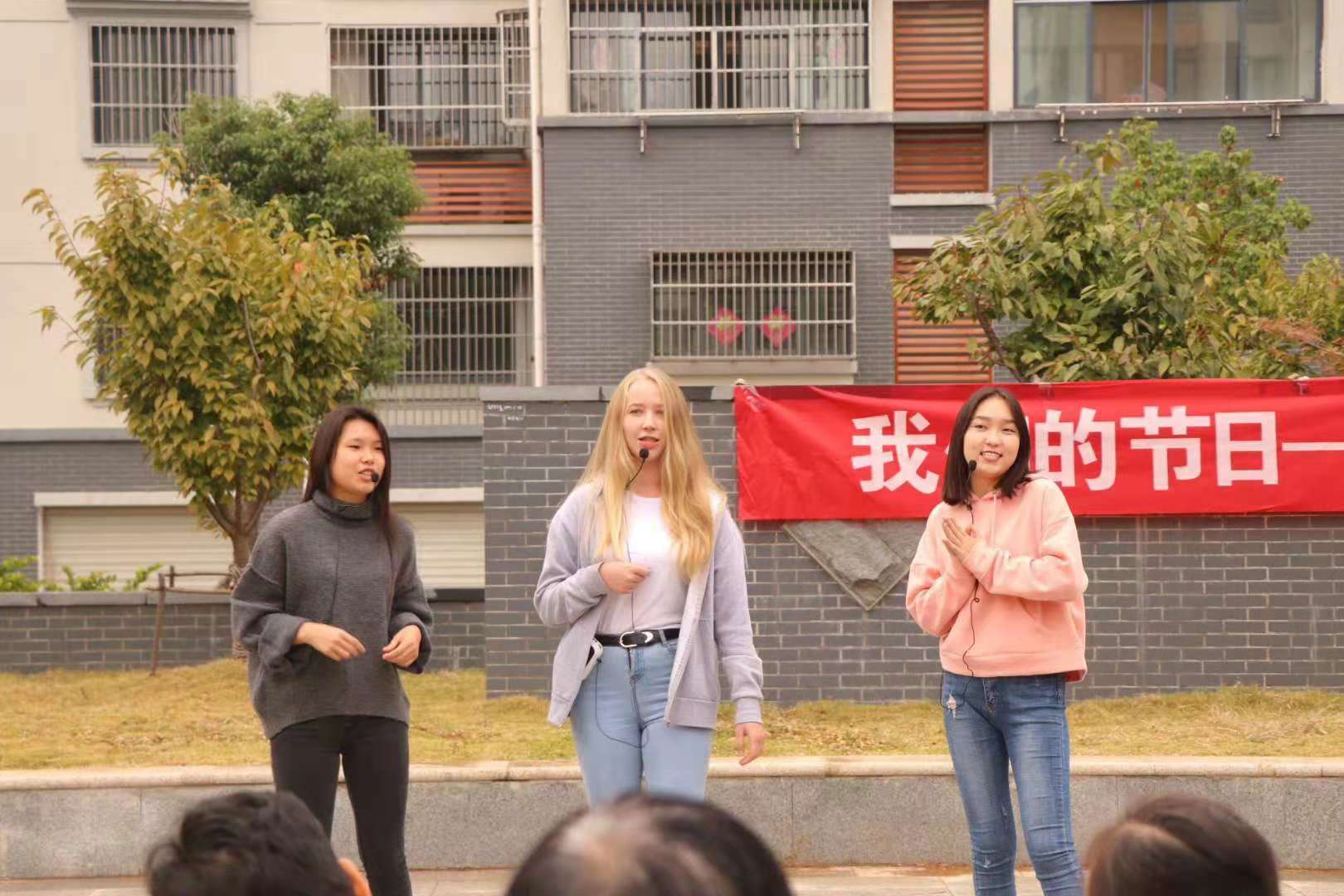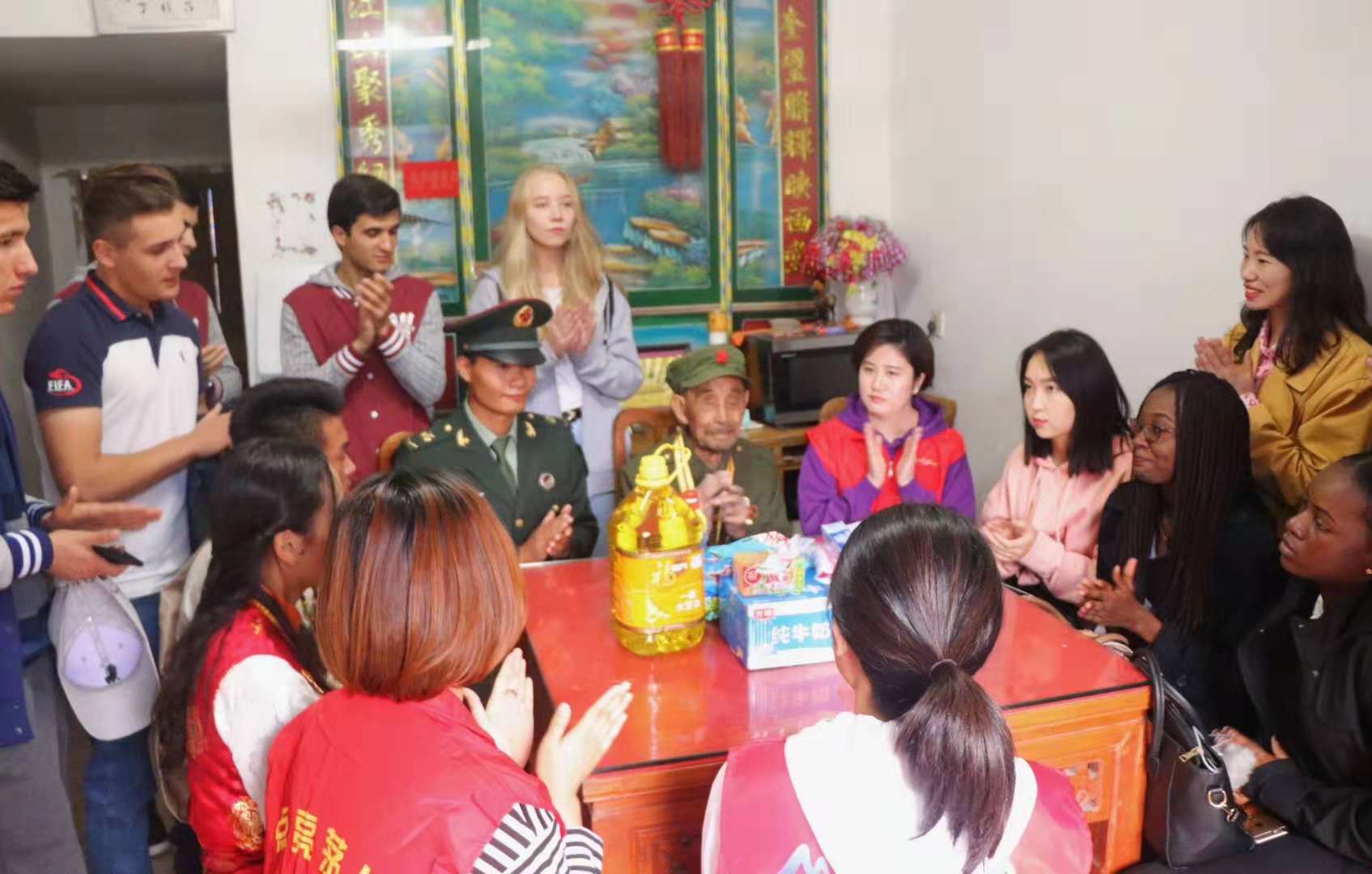 师生代表慰问了茅山风景区玉晨村95岁抗战老兵何忠志,在何忠志老人的家里,师生聆听了老人的抗战故事,随后同学们参观了新四军纪念馆。在福桂小区,学生们准备了精彩的节目,为茅山风景区管委会的老人们展示传统文化表演。茶艺专业学生的茶艺展示、外国留学生的传统民族歌曲等,让老人们领略了不同国家、不同民族的文化魅力。活动最后师生们登高望远,缅怀历史,展望未来。