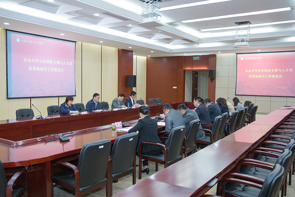 10月12日上午,农业对外合作科技支撑与人才培训基地建设工作推进会在学校综合楼九楼会议室举行。江苏省农业委员会外事外经办公室主任李旭、副主任田玉斌、学校副校长贾君及农业对外合作科技支撑与人才培训基地江苏联合体各单位相关负责同志出席了会议。会议由江苏省农业委员会外事外经办公室副主任田玉斌主持。