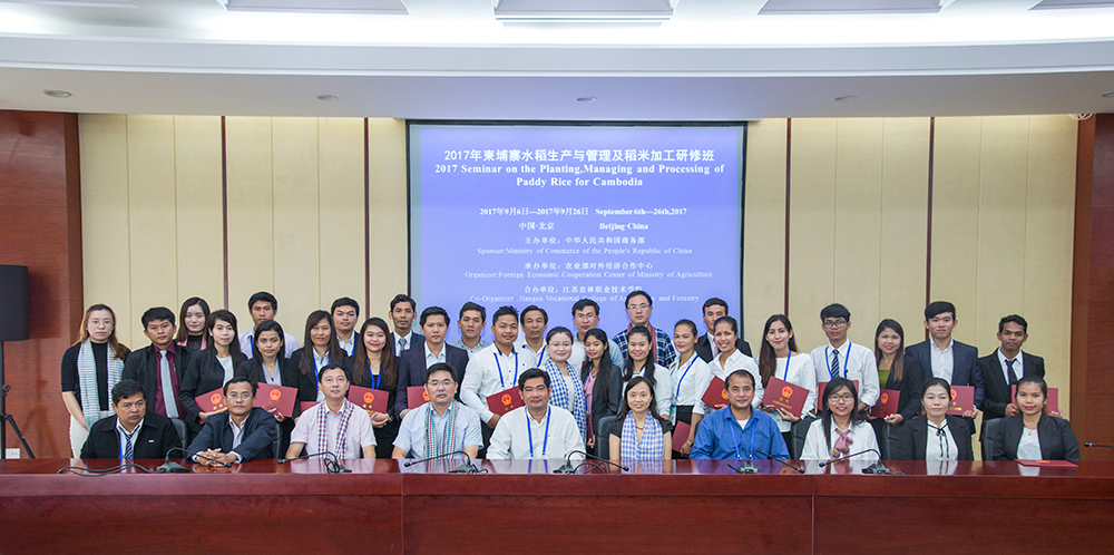 9月26日上午,柬埔寨水稻生产与管理及稻米加工研修班结业典礼在我校综合楼九楼会议室举行。农业部对外经济合作中心项目管理处处长张倩、学校副校长曹仁勇、农学园艺学院党总支副书记杨宝林等相关同志参加了结业典礼。