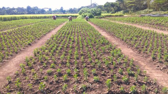 甜叶菊由于它具有高甜度、高安全性、高稳定性、低热量的三高一低天然甜味剂的优异特征,显著优于人工合成的阿斯巴甜等甜味剂。因而,可广泛用于饮料、医药、食品等领域。在非洲乃至全球拥有巨大的市场需求。肯尼亚四季温和、温度日较差大等特殊的气候条件为甜叶菊高产、优质栽培创造了不可多得的自然条件。通过中国-肯尼亚农业科技工作者的精诚合作与不懈努力,肯尼亚甜叶菊栽培技术体系不断完善,将为肯尼亚农业增效、农民增收和农村发展创造新的增长点。