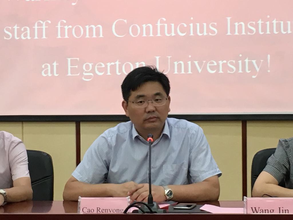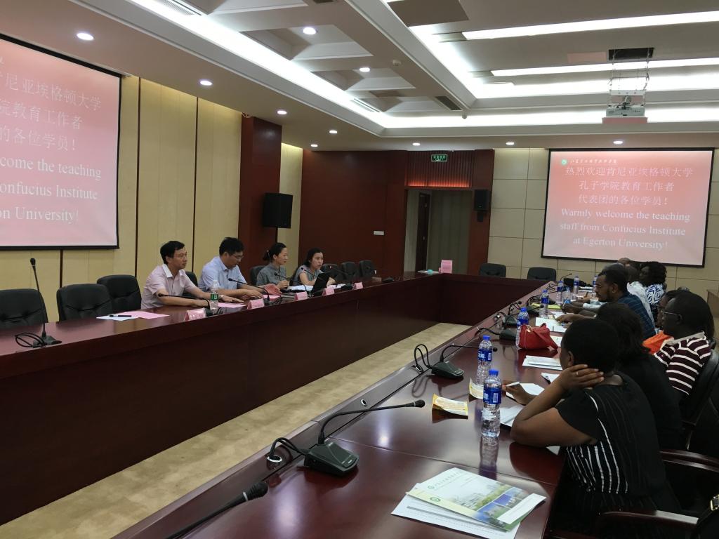 欢迎仪式上曹仁勇副院长向来自肯尼亚埃格顿大学孔子学院教育代表团的学员表示热烈欢迎,并向他们介绍了我院的基本概况、办学特色和国际交流等情况。学员代表Joshua O.Ogendo介绍了埃格顿大学孔子学院的办学条件、师资水平等总体情况,并代表全体学员对我院提供的学习交流机会表示诚挚的感谢。