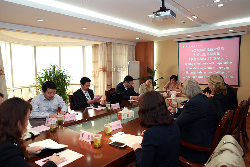 巫建华院长对荷兰职教集团的到来表示热烈欢迎,并简单介绍了我院的基本情况。他希望通过此次合作,既能够使双方的师生受益,还能带动周边区域农场主的发展和培养。海玲•安德林加女士就荷兰诺德温学院的办学特色和教学理念进行了详细的介绍,希望双方能够建立长远的合作关系,在更广的领域开展合作。里茨•范康普先生对合作项目进行了介绍,并代表荷兰Lentiz教育集团与我院签署了联合办学协议,共同开展BTEC课程联合办学项目。