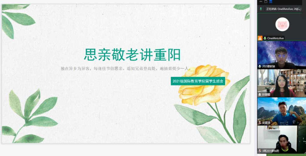 为进一步弘扬中华民族敬老、爱老、孝老的传统美德,让留学生体验中国传统节日,感受中华民族孝老爱亲的传统美德,国际教育学院于10月4日下午举办“思亲敬老讲重阳”线上教育活动,通过本次重阳节传统文化教育,留学生受教匪浅,表达要通过自己的实际行动表达对亲人的感恩。