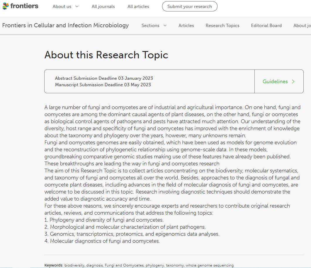 近日,风景园林学院绿色防控科技团队负责人陈佳佳博士受国际学术期刊《Frontiers in Cellular and Infection Microbiology》编辑部邀请,担任该期刊专刊主编辑,负责“Diversity and Molecular Diagnostics of Fungi and Oomycetes in Plants”(真菌与卵菌多样性及分子检测)的前沿专刊。期刊《Frontiers in Cellular and Infection Microbiology》该刊即时影响因子6.0734,JCR一区。