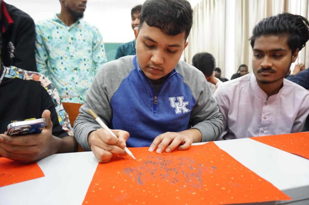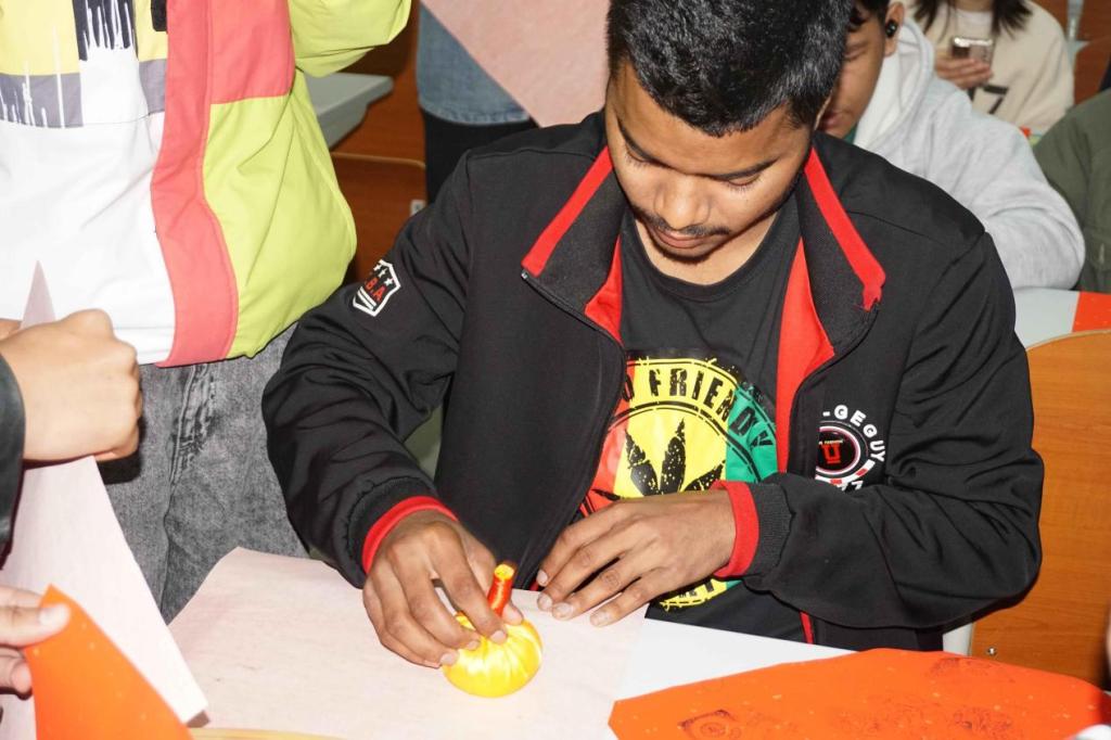 活动伊始,留学生们专心致志地观看《九色鹿》,对影片里敦煌壁画中的九色鹿纹样产生好奇,茶与食品科技学院王老师详细讲解了九色鹿的文化内涵及其在敦煌壁画中的重要地位,很多同学们对此产生浓厚兴趣。随后的实践环节,同学们使用雕版印刷技术,在年画纸上印制了中国传统纹样——“福”字纹。活动中,中外学生一同动手,共同探索艺术的奥秘,增进了彼此之间的文化交流与理解,活动现场气氛热烈。