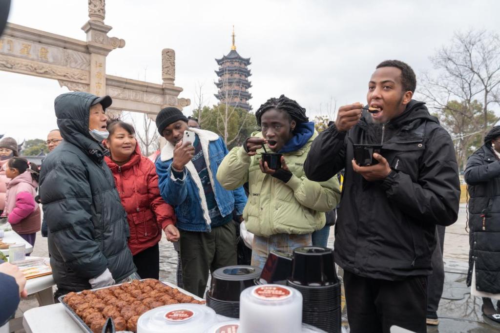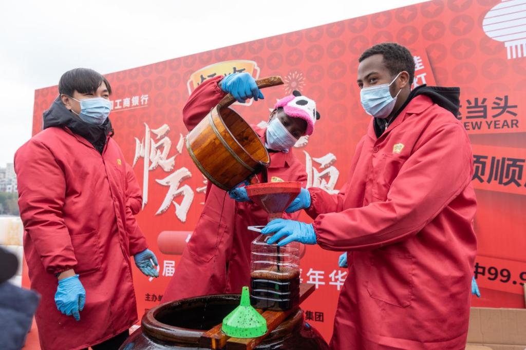 鞭炮碎红铺地,留学生们涌入春节大集。南乡花船穿行,福字灯笼摇曳;春城马灯阵舞踏鼓奔腾。他们围聚贴着“酱”字红纸的大缸,学着用长柄木勺探入深褐酱料。老师傅一声“打了酱油好过年”的吆喝,伴着醇厚酱香漫开。八仙桌上,句容八福碗热气蒸腾:茅山老鹅泛琥珀光泽,百页结吸饱浓汁。他们从中尝到了中国人将平凡日子熬煮成年味的智慧。
