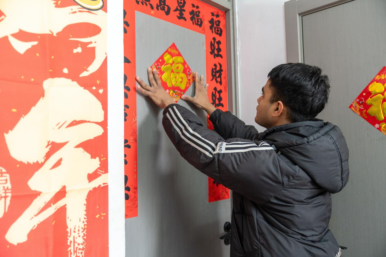 贴春联成为生动的汉语课。老师讲解“梅开五福竹报三多”的平仄对仗,留学生们听得入神。津巴布韦的同学指着“春”字说:“这真像太阳从大地升起。”来自阿富汗的同伴被对联的意境吸引,小心翼翼将红纸贴在宿舍门前。整条长廊渐次染上红色,每扇门都诉说着独特的祝福。