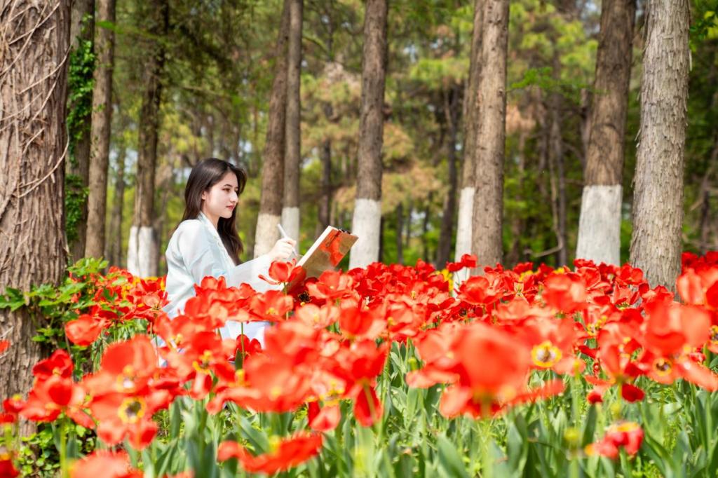 活动首站为江苏农博园与伏热花海。郁金香、樱花、虞美人争奇斗艳,景色美轮美奂。留学生们身着精致汉服,衣摆随风飘动,漫步于花间小径,纷纷停下脚步拍照留念。擅长绘画的学生架起画板进行写生,以水彩与素描描绘眼前的烂漫春光。“身着汉服漫步于花海之中,我仿佛置身于中国画的意境里。”来自阿富汗的留学生张亚莎激动地表示。同样来自阿富汗的KHAN MARYAM也说道:“我要将这幅画作寄给家人,让他们也领略中国春天的秀丽景色。”