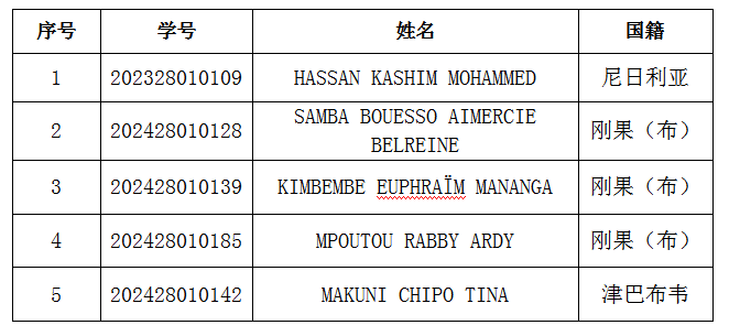 以上5名同学系我院2023级国际学生、2024级国际学生,因个人原因回国,未能如期返校。经所在院系与国际教育学院多次尝试,目前仍无法与该5名同学取得联系。请以上同学在公告后10个工作日内与国际教育学院联系,联系电话:+8651187290608,邮箱:gjjl@jsafc.edu.cn。10个工作日内未能与国际教育学院取得联系的,按照有关规定予以退学。